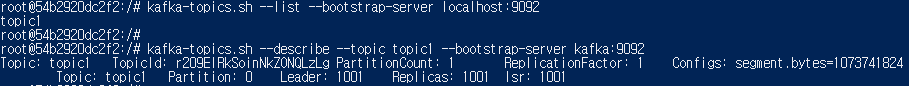 토픽 상세 조회: kafka-topics.sh --describe --topic topic1 --bootstrap-server kafka:9092