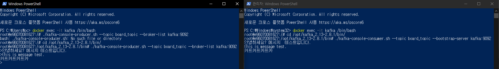 왼쪽이 프로듀서, 오른쪽이 컨슈머로 프로듀서에서 메시지가 등록됨과 동시에 컨슈머에서 메시지가 도착한다.