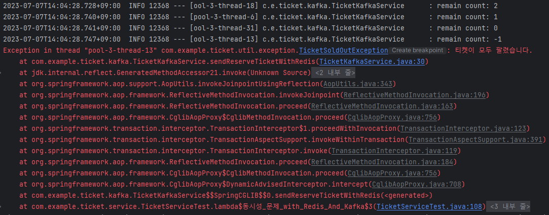 다음과 같이 티켓이 매진되면 예외를 던져서 더 이상 카프카에 메시지 적재를 안 해준다.